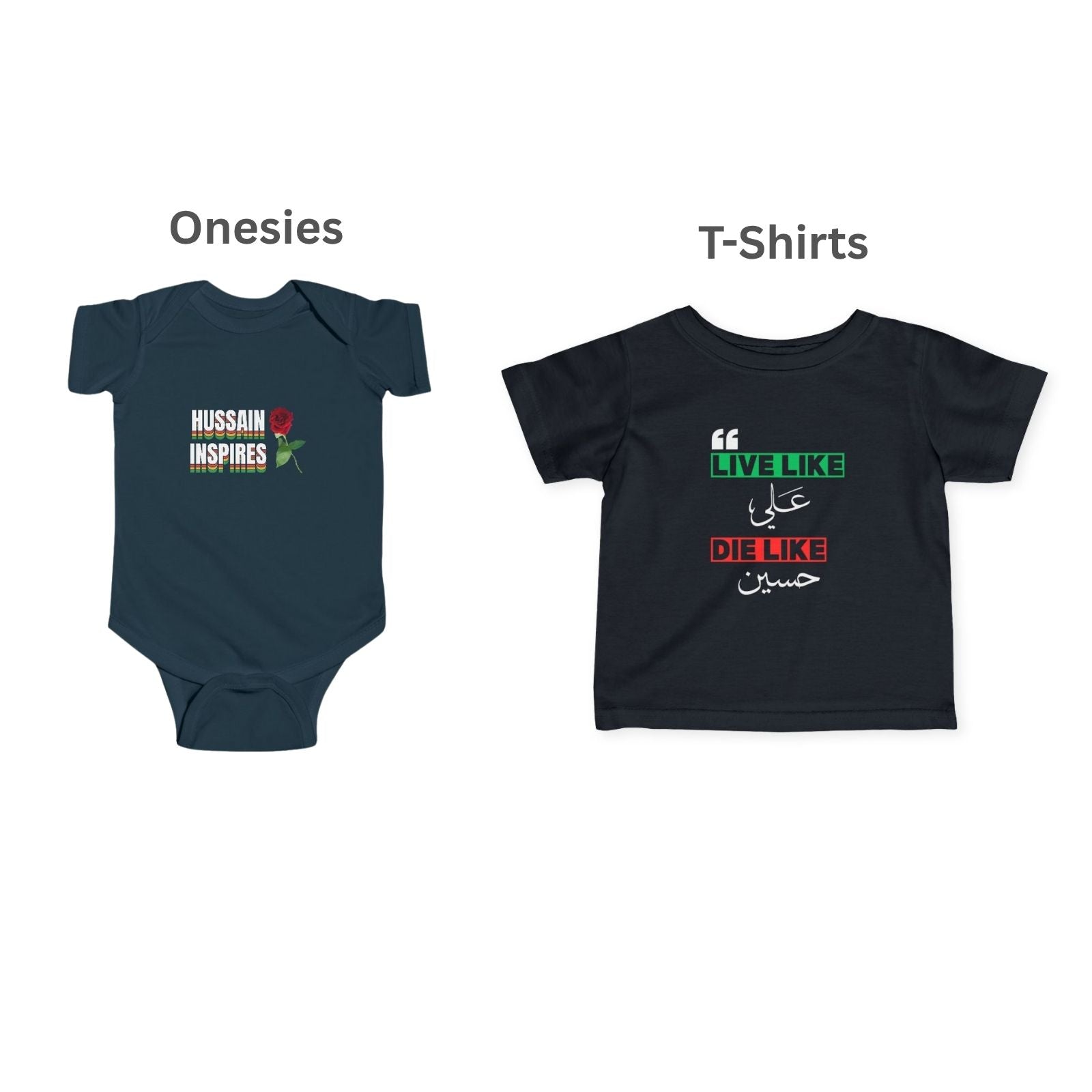 Our Infant Collection features soft, cozy onesies and baby t-shirts designed to gently introduce your little one to the love and remembrance of Imam Hussain (A) and the story of Karbala. Perfect for special occasions or Majalis gatherings, these designs share powerful messages in a heartwarming and age-appropriate way. Available in U.S. infant sizes (0–24 months) and a wide range of colors to match every baby's personality.