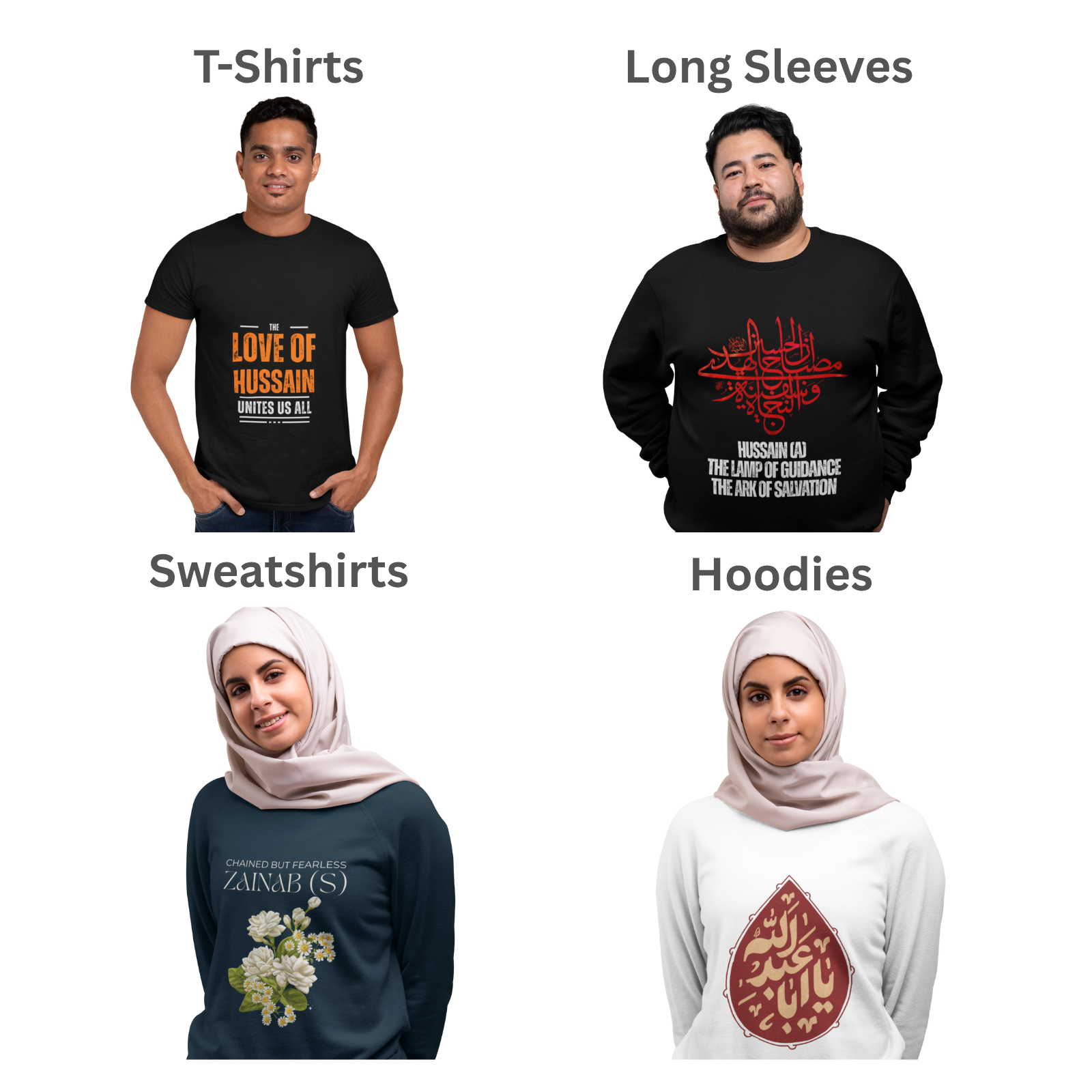 Our Adults Collection is designed to help you wear the message of Karbala with pride. From t-shirts and long-sleeves to sweatshirts and hoodies, each item is available in US adult sizes (XS to XL) and comes in a variety of colors. Celebrate the Ahlulbayt (A) and the spirit of Muharram with comfort, style, and meaning.