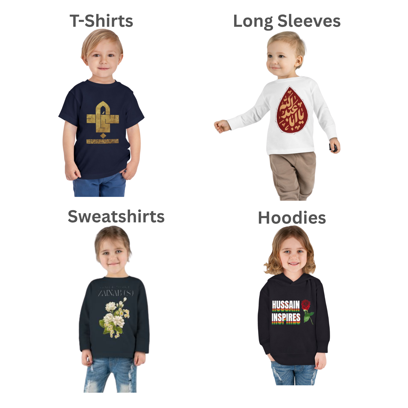 Our Toddlers Collection offers adorable t-shirts, long-sleeves, sweatshirts, and hoodies that introduce children to the love and remembrance of Imam Hussain (A) and the events of Karbala. Available in US toddler sizes (up to 5-6T) with a wide range of colors to match every child’s personality.